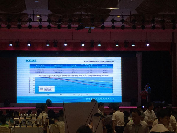 2015年5月29日,電子變壓器、電感器行業(yè)技術(shù)峰會(huì)——“第四屆自動(dòng)化生產(chǎn)暨高性能磁性材料技術(shù)研討會(huì)”在東莞嘉輝會(huì)酒店盛大召開。我司市場(chǎng)拓展部的同事也參加了此次研討會(huì)并在現(xiàn)場(chǎng)進(jìn)行了展示,Alan發(fā)表了有關(guān)應(yīng)用于電源的新一代金屬磁粉芯的演講。